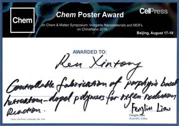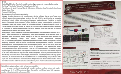 8月19日-21日,第八届中国国际纳米科学技术大会(ChinaNANO 2019)在北京国际会议中心召开。我校特种功能材料重点实验室白锋教授课题组硕士研究生任希彤的墙报“Controllable Fabrication of Porphyrin Based Heteroatom-doped Polymers for Oxygen Reduction Reaction”荣获第二分会“最佳Poster奖”。Poster主要涉及一种卟啉基聚合物材料的可控制备方法及其相关电催化性能的研究,为高温形貌保持的卟啉基电催化材料提供了一种新的思路。该项研究得到了主播视频 研究生“英才计划”的资助。