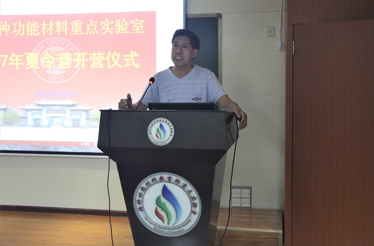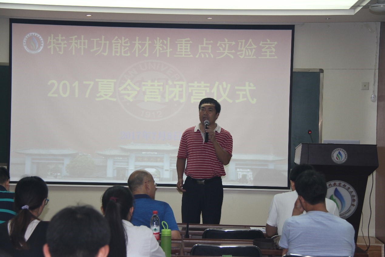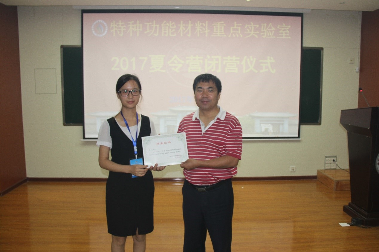 ,了解特种功能材料重点实验室,热爱学习,热衷科研,能激起同学们的科研热情和兴趣,并希望明年在研究生复试中能再见到大家。营员代表们表示一周来的学习和生活,彼此间结下了深厚的友谊,通过老师们深入浅出的介绍,对自己的学习有了更进一步的了解,在人生的一个关键节点上,老师们用各自丰富的学识、真诚的态度、以及自身的经历给自己上了难忘的一课,也更加明确了自己未来的发展规划。同学们感谢为夏令营付出的所有老师和师兄师姐,相约明年一并考入实验室。实验室常务副主任杜祖亮教授为每位营员颁发了结业证书,省特聘教授武四新教授为获得优秀营员的同学颁发了优秀营员证书。